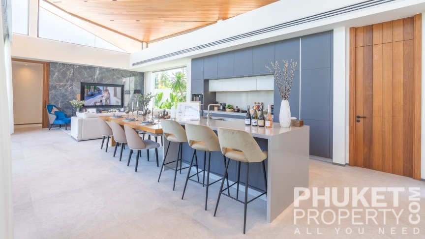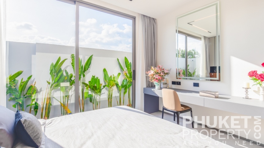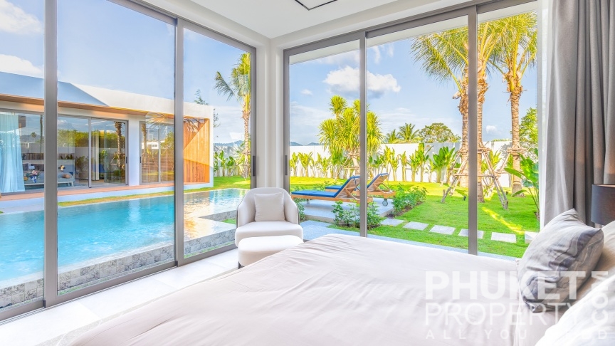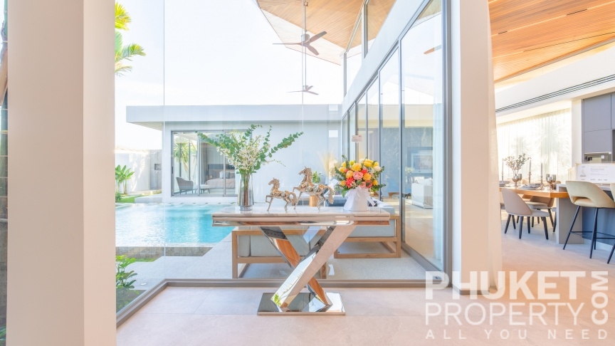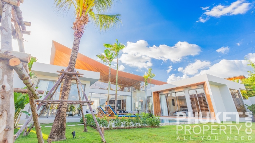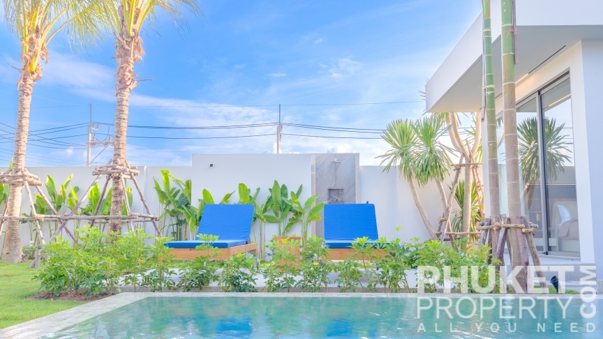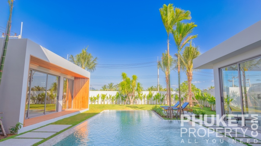 This 3 bed luxury pool villa located close to Laguna, is for sale through PhuketProperty.com in a quiet area of Pasak in Cherng Talay, Phuket. The project has just 9 limited edition villas with a number 3 and 4 bedroom formats available. Located close to Layan Beach and the main areas of Boat Avenue and Laguna with golf access. The villas are of a contemporary tropical style with high ceilings and ample glass. This villa is a spacious 3 bedroom format on a unique sized land plot. Please contact us directly at PhuketProperty.com, Phuket luxury property agents since 1998, for more information or to view this 3 bed luxury pool villa for sale near Laguna, Phuket.